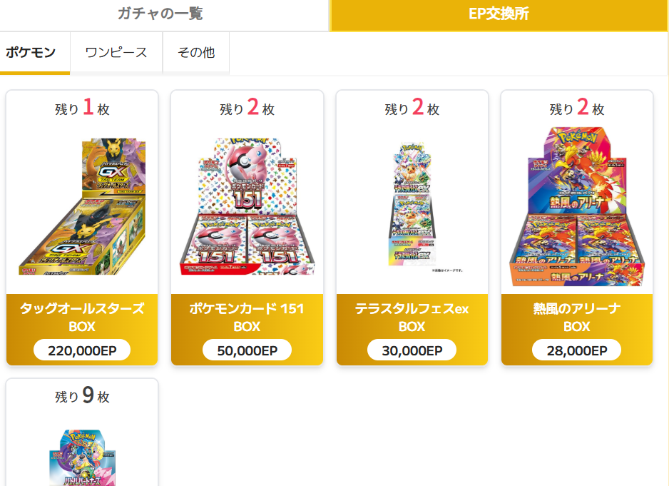 イブガチャには「EP交換所」と言ったオリパを購入した際の還元Ptシステムがあります。